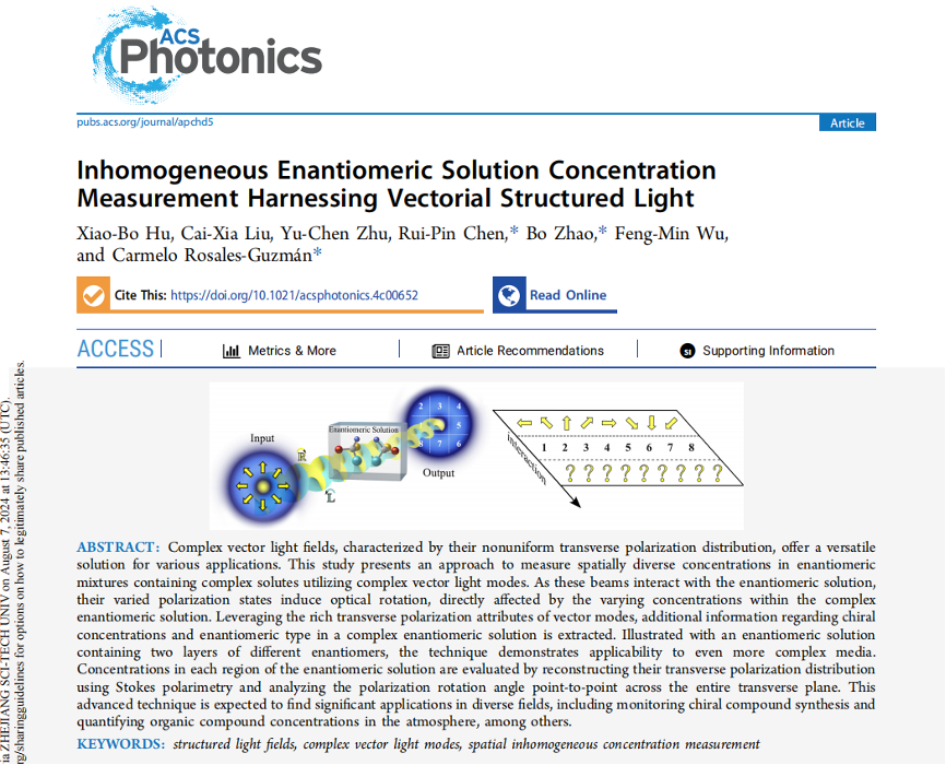 近日,浙江理工大学理学院陈瑞品教授团队与墨西哥光子研究所Carmelo Rosales Guzmán研究员共同合作在光学领域国际知名期刊《ACS Photonics》上刊发了题为“Inhomogeneous Enantiomeric Solution Concentration Measurement Harnessing Vectorial Structured Light”的学术论文。理学院物理系青年教师胡晓博讲师为论文第一作者,陈瑞品教授为共同通讯作者,浙江理工大学,全省量子物态与光场调控重点实验室为论文署名单位。该工作得到了浙江省自然科学基金、国家自然科学基金、浙江省“尖兵”“领雁”重点研发项目支持。