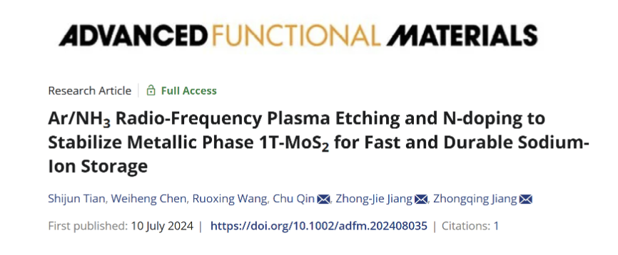 近日,浙江理工大学理学院物理系蒋仲庆教授/青年教师秦楚博士在钠离子电池负极领域取得新进展,相关工作以“Ar/NH3 Radio-Frequency Plasma Etching and N-doping to Stabilize Metallic Phase 1T-MoS2 for Fast and Durable Sodium-Ion Storage”为题发表在国际著名学术期刊《Advanced Functional Materials》(IF=18.5)上。理学院硕士生田时君和机械工程学院博士生陈巍衡为共同第一作者,秦楚博士和蒋仲庆教授为共同通讯作者,浙江理工大学为论文第一通讯单位。该工作得到了浙江省自然科学基金杰出青年基金项目、国家自然科学基金等项目支持。