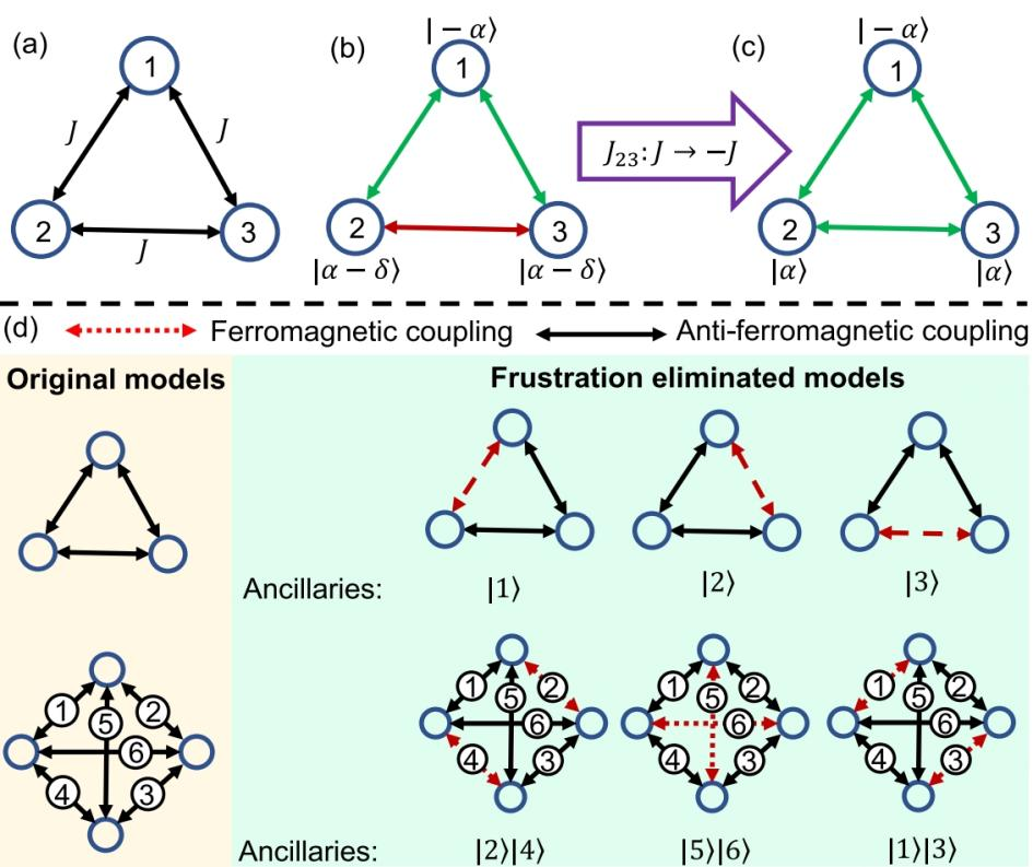 图1:阻挫消除的原理演示。(a-c)对于一个特定基态,可以通过改变自旋间耦合的类型来消除阻挫。(d)对于任意伊辛模型,可通过辅助模式来等效为数个无阻挫模型。