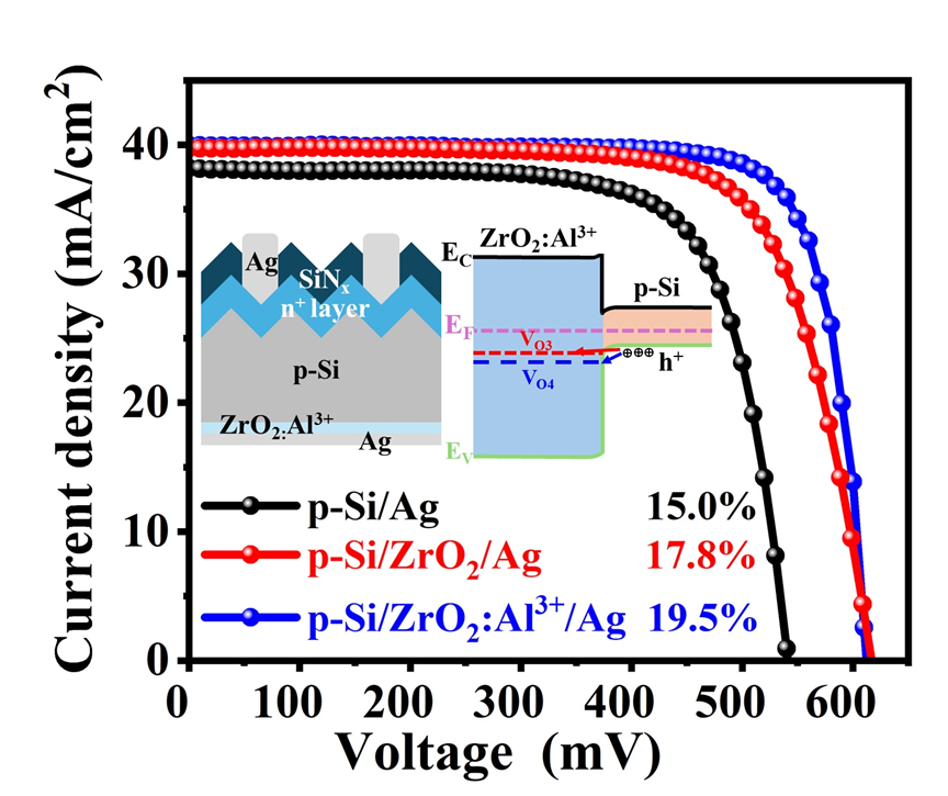 过渡金属氧化物(TMOs)与晶体硅(c-Si)构建的载流子选择性钝化接触异质结太阳电池引起了业界广泛的关注。其中氧化锆(ZrO2)具有优秀的钝化性能、高相对介电常数、优异的热和化学稳定性等优点,然而由于超宽带隙(~5.8 eV)和与硅不匹配的能带结构,通常认为其无法用于钝化接触。在这项工作中,我们证明了氧空位(VO)缺陷调控的ZrO2薄膜具有作为空穴钝化接触层的巨大潜力。ZrO2薄膜表现出优异的硅表面钝化效果,有效载流子寿命(τeff)由197 μs提升至309 μs。并且,引入Al3+掺杂增加了薄膜中VO的浓度,同时调节了不同配位结构的VO的比例,为空穴传输提供有效的陷阱辅助隧穿路径,显著提升了空穴传输性能,接触电阻率(ρc)从246 mΩ·cm-2降低到52 mΩ·cm-2。最终,基于p-Si/ZrO2:Al3+/Ag结构的太阳电池器件的光电转换效率从15.0%提升为19.5%。这项研究不仅拓宽了超宽带隙半导体的应用,揭示缺陷调控对载流子选择性传输的重要作用,还为c-Si钝化接触太阳电池的探索和发展提供了新的研究思路。