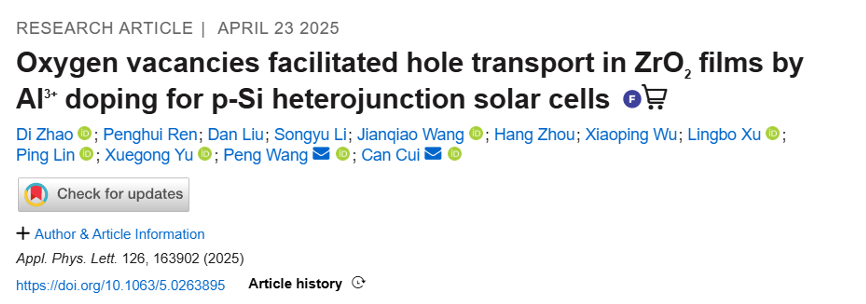 近日,浙江理工大学理学院物理系王朋副教授/崔灿教授在晶体硅太阳电池钝化接触领域取得重要进展,相关成果以“Oxygen vacancies facilitated hole transport in ZrO2 films by Al3+ doping for p-Si heterojunction solar cells”为题发表在应用物理领域国际知名期刊《Applied Physics Letters》上,并被选为亮点论文(Featured Article)。理学院22级硕士生赵迪(光电信息工程专业)为第一作者,王朋副教授和崔灿教授为共同通讯作者,浙江理工大学为论文唯一通讯单位。该工作得到了国家自然科学基金、浙江省自然科学基金项目的支持。