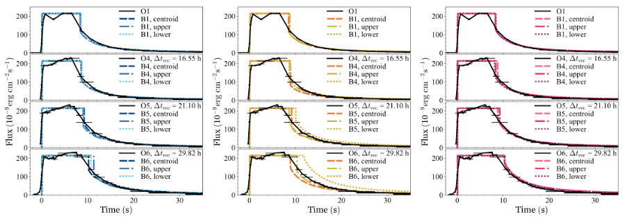 学者们通过使用精准定出的镓-63和铬-64质子俘获热核反应率(见 Lu 等人(2022)的工作),及KEPLER程序所建构的前沿周期性(GS 1826–24暴源)和光球半径膨胀(SAX J1808.4–3658暴源)X射线暴模型来研究该新反应率对光变曲线的影响。他们发现该两种新反应率对受约束的前沿周期性X射线暴模型只有可忽略的影响,并对中国科学院近代物理研究所在2023年发表在Nature Physics的结果提出质疑(图2),而该结果是基于不受严格约束的X射线暴模型求出,而且该工作只使用了新质子分离能,并没以新质子分离能求出新反应率再用到X射线暴天体模型里。虽然该两种新反应率不影响周期性X射线暴,但却对光球半径膨胀X射线暴模型有可观的影响(图3)。本研究结果也为将来修正光球半径膨胀X射线暴模型提供关键性依据。