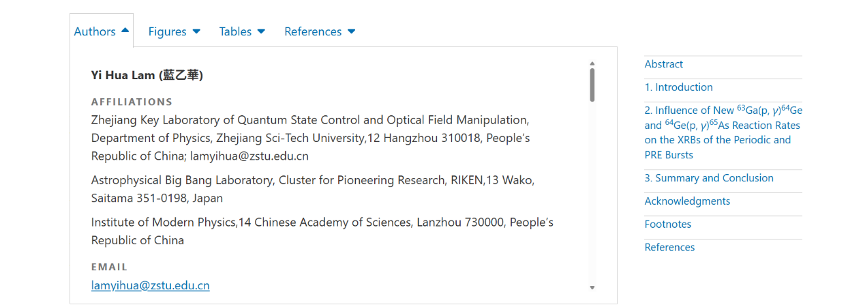近日,天文天体物理领域国际知名期刊《The Astrophysical Journal》上刊发了题为“The Regulated GeAs Cycles with the New 63Ga(p,γ)64Ge and 64Ge(p,γ)65As Reaction Rates and Its Impact on the GS 1826−24 Clocked Bursts and SAX J1808.4−3658 Photospheric Radius Expansion Bursts”的学术论文。理学院物理学系特聘教授蓝乙华为论文第一作者,浙江理工大学、全省量子物态与光场调控重点实验室为论文署名单位。该工作得到了国家自然科学基金、浙江理工大学基础研究、中国科学院国际人才等项目支持。