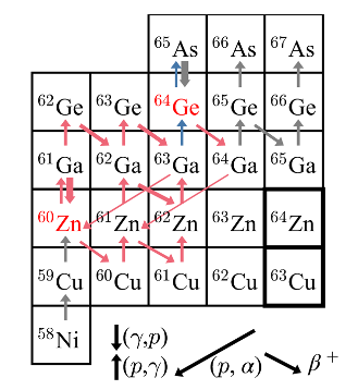 在发生有高氢丰度的I型X射线暴点火时,快质子俘获核反应路径将经过铬砷循环(GeAs cycle),而该循环深受镓-63和铬-64质子俘获热核反应率影响,并且大部分的核反应流都从铬砷循环传到更重的丰质子原子核区(见图1),然后在该核区产生更多的氢燃烧。按Johnston等人的研究发现,若以氦丰度为主的I型X射线暴点火,铬砷循环以及更重核区极是快质子俘获核反应路径的终点处。因此使用精确定出的镓-63和铬-64质子俘获热核反应率将让我们更有能力重现观测X射线暴光变曲线,从而让天文天体物理学界以及核天体物理学界对时钟型及光球半径膨胀X射线暴有更深度的理解。