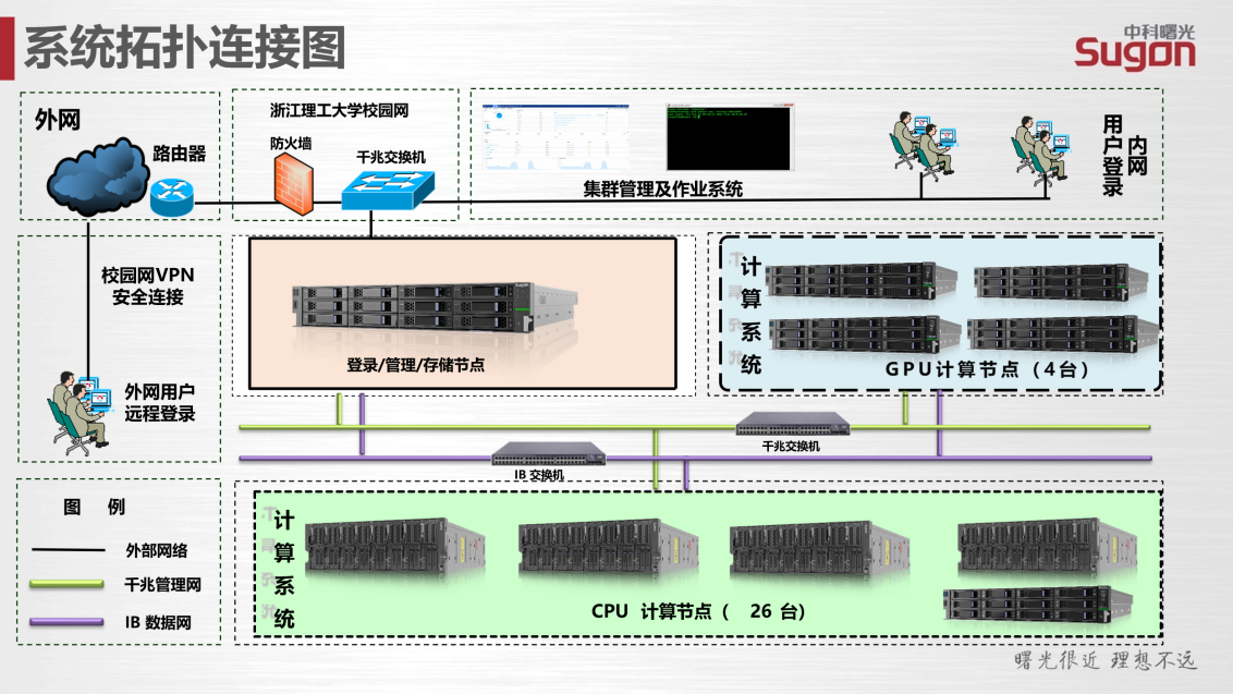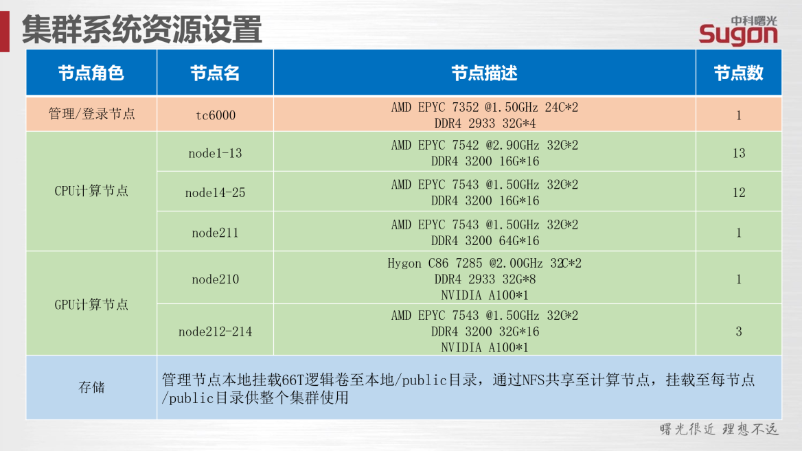 本平台配置26个AMD EPYC 7542刀片计算节点(256GB内存/节点)、1个AMD EPYC 7543胖节点(1TB内存)及4个NVIDIA A100 GPU计算节点。所有节点采用统一认证管理系统,用户需通过SSH协议远程登录Linux系统进行操作。